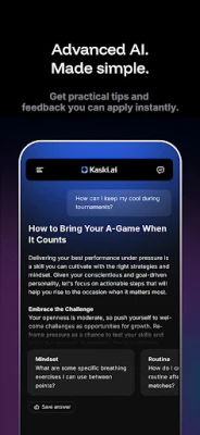 Kaski.ai leidžia jums atrasti savo unikalias stiprybes, remiantis moksliškai patvirtintu „Didžiojo Penketo" asmenybės modeliu. Sukaupti duomenys iš daugiau nei 20 000 realių pavyzdžių užtikrina tikslų jūsų asmenybės žemėlapį, padedantį treniruotis ir varžytis būdais, kurie geriausiai tinka būtent jums. Jūsų asmeninis dirbtinio intelekto mentorius prisitaiko prie jūsų asmenybės, tikslų ir treniruočių stiliaus, teikdamas prasmingus pokalbius, praktinius patarimus ir mentalines strategijas, pritaikytas konkrečiai jūsų žaidimui. Nuo ramybės išlaikymo kritinėmis akimirkomis iki pasitikėjimo savimi stiprinimo – kiekviena įžvalga padeda pasiekti aukščiausių rezultatų tada, kai to labiausiai reikia.