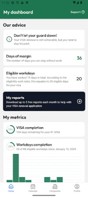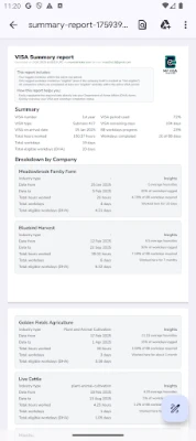 Atsisveikinkite su sudėtingais skaičiavimais ranka ir pasisveikinkite su sklandžiu darbo valandų fiksavimu bei galingomis, vieno mygtuko paspaudimu generuojamomis ataskaitomis. „My Visa Tracker" intuityvi sąsaja užtikrina, kad visada žinotumėte savo pažangą. Mūsų naujos VISA suvestinės ataskaitos, specialiai sukurtos tiems, kurie siekia įvykdyti nustatytų 88 dienų darbo reikalavimus, supaprastina procesą. Šios ataskaitos yra suformatuotos taip, kad duomenis būtų galima lengvai nukopijuoti ir įklijuoti tiesiai į Australijos vidaus reikalų departamento (DHA) formas, užtikrinant tikslumą ir sumažinant stresą. Kas mėnesį galite gauti iki 5 nemokamų suvestinių ataskaitų, leidžiančių nuolat stebėti savo darbo istoriją ir atitikimą vizos sąlygoms.