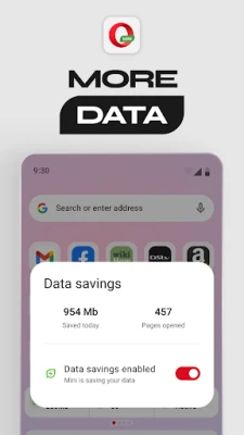 „Opera Mini" transformuoja jūsų kasdienę naršymo patirtį, paversdama ją ne tik greitesne, bet ir malonesne. Su integruotu reklamų blokavimu atsisveikinkite su erzinančiais iššokančiais langais ir nepageidaujamu turiniu, mėgaudamiesi švaria bei nepertraukiama interneto erdve. Ši naršyklė sumaniai taupo jūsų mobiliuosius duomenis, leidžiančia ilgiau mėgautis mėgstamu turiniu be papildomų išlaidų. Patikrinkite sutaupytų duomenų kiekį nustatymų meniu ir įsitikinkite, kaip efektyviai „Opera Mini" rūpinasi jūsų resursais.