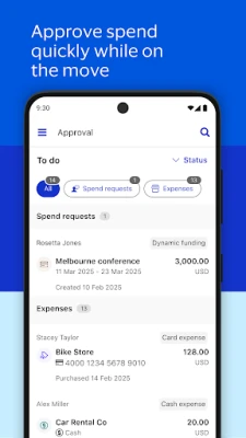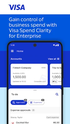 Taupykite laiką ir pinigus, efektyviai valdydami savo įmonės išlaidas nuolat. „Visa Spend Clarity for Enterprise" programėlė suteikia patogų išlaidų valdymą tiesiog po ranka. Lengvai peržiūrėkite, koduokite ir patvirtinkite visas išlaidas bet kuriuo metu ir bet kurioje vietoje.
