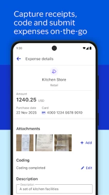 Programos funkcionalumas apima viską, ko reikia efektyviam išlaidų valdymui. Greitai fiksuokite duomenis iš savo komercinių kortelių pirkinių, darykite kvitų nuotraukas tiesiogiai savo įrenginiu ir akimirksniu susiekite jas su atitinkamomis išlaidomis. Patogiai tvarkykite kvitų vaizdus bibliotekoje, koduokite ir teikite išlaidas tvirtinimui, o vadovai gali jas patvirtinti vos keliais paspaudimais. Visa tai vyksta pagal griežčiausius „Visa Global Security" standartus, garantuojant jūsų duomenų saugumą. Atkreipkite dėmesį, kad ši programa yra skirta esamiems „Visa Spend Clarity for Enterprise" žiniatinklio sprendimo vartotojams.